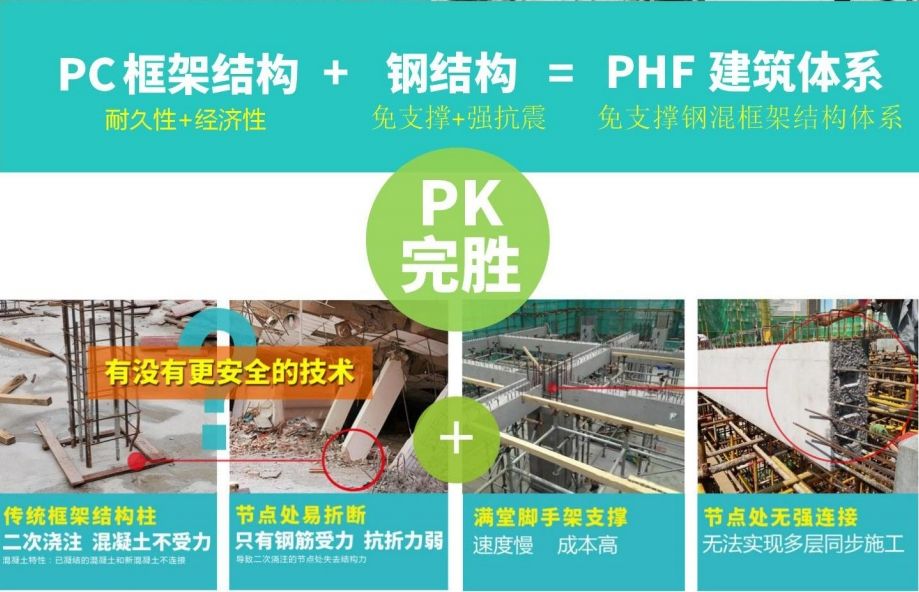 PHF建筑體系將 PC 構(gòu)件與鋼結(jié)構(gòu)連接方式有機結(jié)合、混合應(yīng)用,綜合了傳統(tǒng) PC 結(jié)構(gòu)和鋼結(jié)構(gòu)的優(yōu)勢,揚長避短,施工更高效、效益更顯著。為行業(yè)開辟了一條新的賽道。